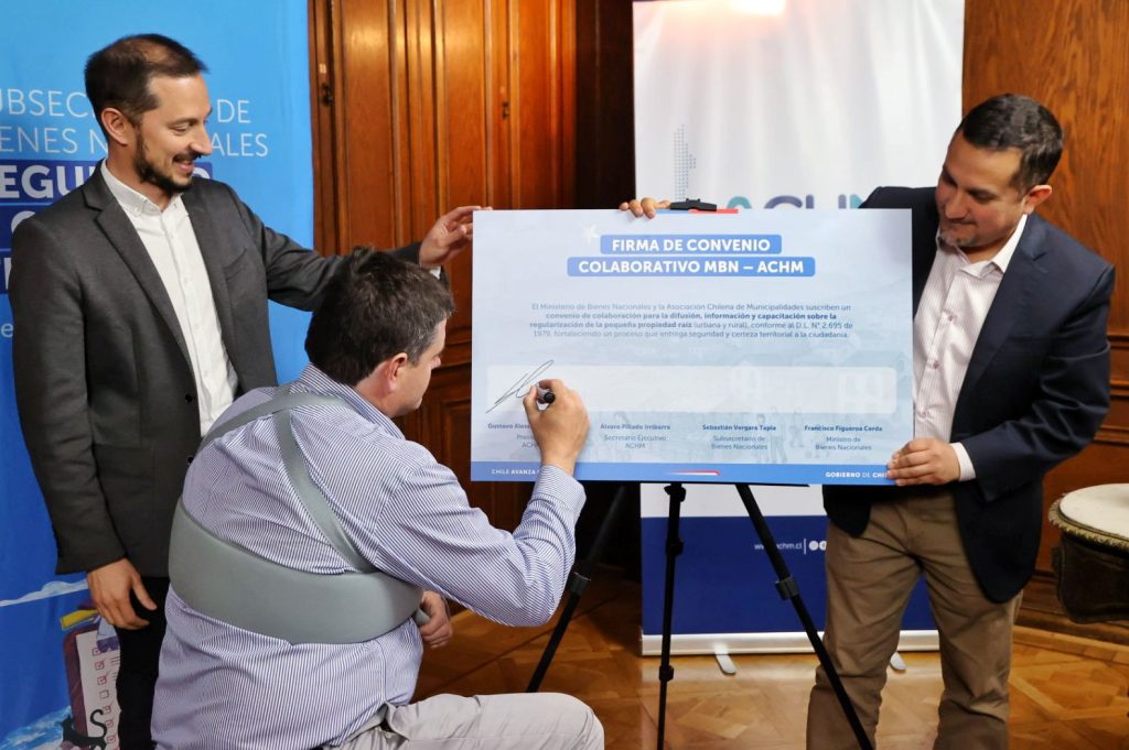 En una ceremonia realizada en el Ministerio de Bienes Nacionales, la Subsecretaría de esa cartera firmó un convenio de colaboración con la Asociación Chilena de Municipalidades (ACHM) con el objetivo de fortalecer la difusión, información y capacitación sobre el procedimiento de regularización de la pequeña propiedad raíz, tanto urbana como rural, conforme al Decreto Ley N° 2.695 de 1979.