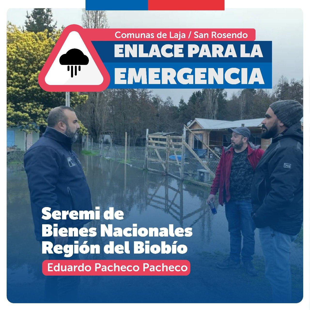 - Región del Biobío: En Biobío, en tanto, el seremi Eduardo Pacheco es enlace en las comunas de Lajas y San Rosendo. En esta misma región nuestros equipos de la seremi están colaborando con el monitoreo de la DGA a través de nuestro drone para registrar situaciones de desbordes de los ríos Andalién y Biobío.