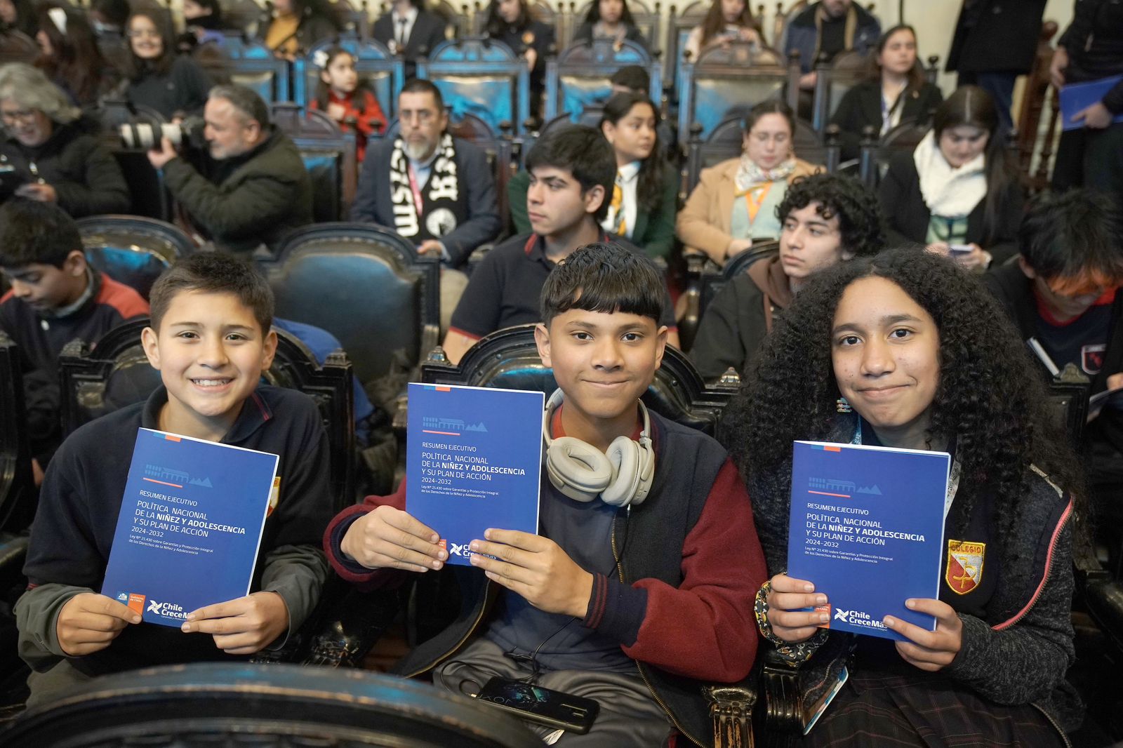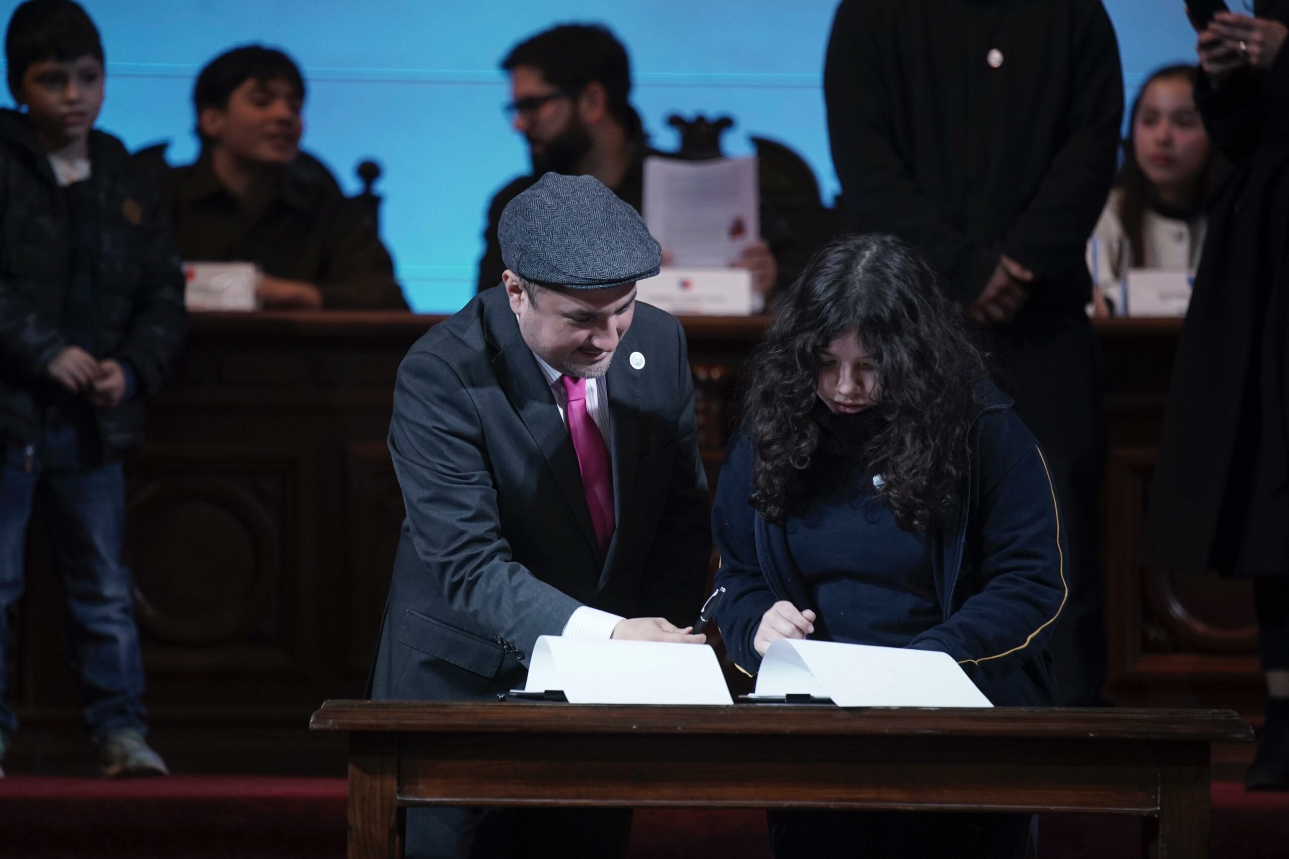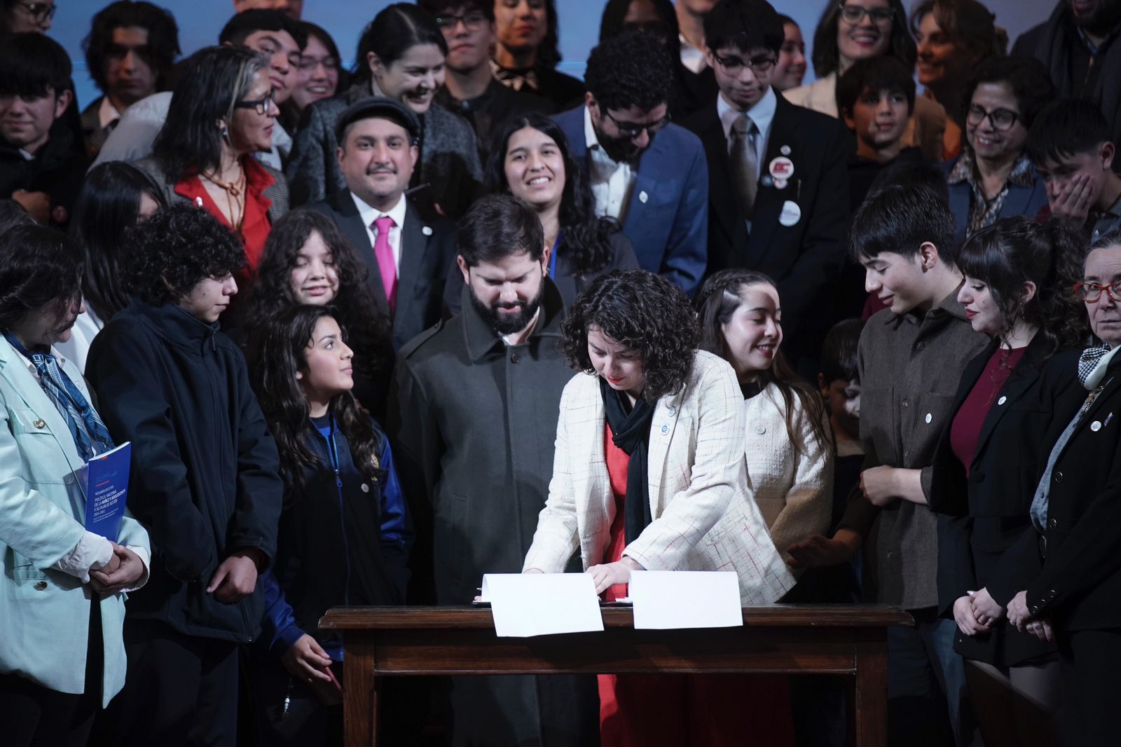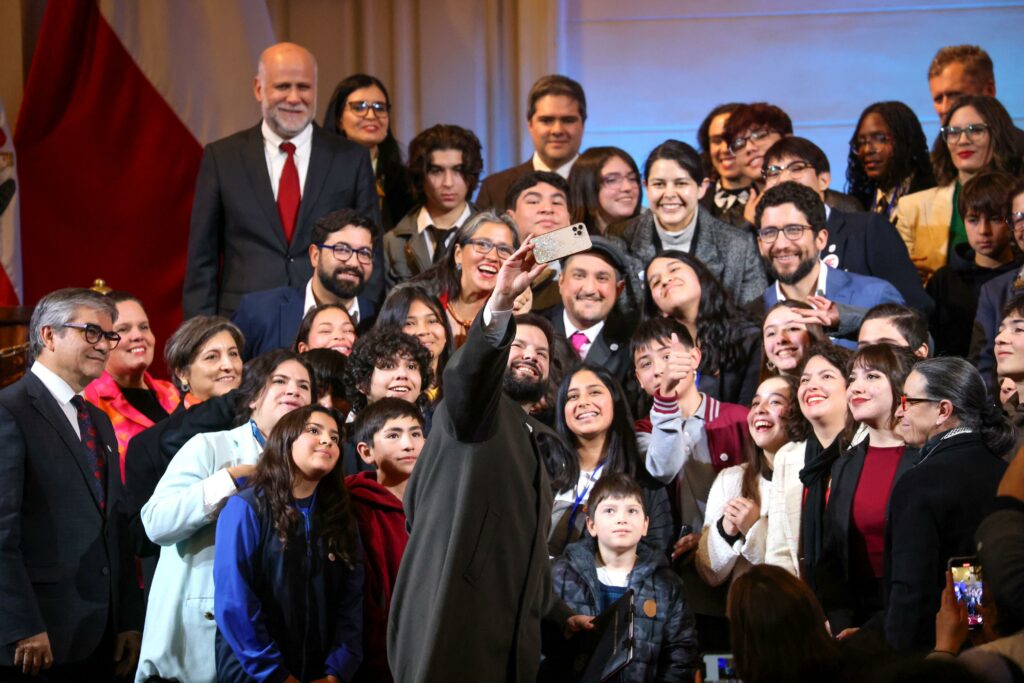 Junto a la Ministra de Desarrollo Social y Familia, Javiera Toro, la subsecretaria de la Niñez, Verónica Silva y a la directiva del Consejo Consultivo de Niñez y Adolescencia, compuesta Francisca Cataldo, Antonia Romero y Samuel Rodríguez; el Presidente Gabriel Boric firmó la Política Nacional de la Niñez y Adolescencia y su plan de acción 2024-2032.